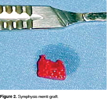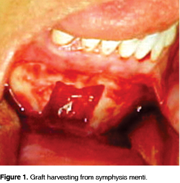 Endotracheal intubation was established. A graft from the symphysis menti was first harvested conducting intra-oral approach in the anterior section of the mandible. Incision was placed at 5 mm underneath the muco-gingival insertion, from canine to canine, exposing thus the bony tissue of the symphysis. With a bur, an approximately 10 mm per side square was traced, reaching, in depth, cancellous bone (Figure 1). A 45° inclination was given to the osteotomy border, on all sides. With a fine, curved chisel, the graft was harvested. The graft was then immersed in saline solution. Hemostatic measures were undertaken with wax on the surgical bed. Oral mucosa was sutured with Vycril 3-0 (Figure 2).