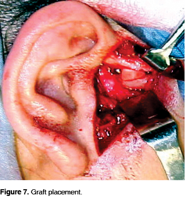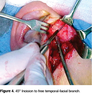 In the present study, a pre-auricular approach, in the shape of seagull wings, was undertaken. This technique avoids damaging the auricular-temporal branch of the facial nerve. Upon arriving to the fascia of the temporal muscle, it is imperative to perform a 45° incision above it, so as to be able to reflect temporal and frontal branches of the facial nerve and avoid inflicting lesions on them, which would later cause paresthesia. When following this approach, proper vision of bone structures where osteotomy is to be performed is achieved, as well as the ragged fracture , where, at a later point, the graft is going to be lodged. This technique also offers a more aesthetic and less invasive approach.