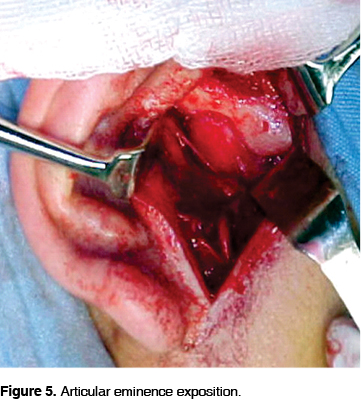Once asepsis and antisepsis of pre-auricular area were achieved (Figure 3), pre-auricular approach was undertaken, incising skin and subcutaneous cellular tissue, until reaching the temporalis superficial fascia. Palpation was performed on the zygomatic arch, an incision was then executed at 45° with respect to the arch, to free the temporal-frontal ramus from the facial nerve (Figure 4). Careful dissection of the superficial fascia and capsule was undertaken, until uncovering the glenoid cavity, articular eminence and one third of the zygomatic arch (Figure 5).