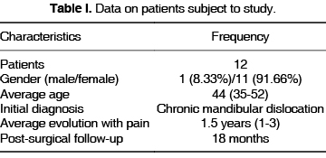 The present study was undertaken at the 1o de Octubre ISSSTE Regional Hospital. In 2006, 12 patients underwent surgery, one male and 11 female. Age rank was from 35 to 52 years, average age was 44 years. After clinical and radiographic examination, emitted diagnosis on patients (linear tomography) was the following: mandibular chronic dislocations (at least three previous events) with pain symptomatology equal to or above 8 in the Analogous Visual Scale (AVS). Evolution was in average 1.5 years.1-3 Oral opening was 55 mm or more. Patients had been conventionally treated, for at least three months previously, with muscle re-programming exercises, physical therapy, placement of class III elastics, application of botulinum toxin in external pterygoid muscle. All the aforementioned methods proved to be unsuccessful (Table I).