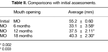 Initial oral opening (average 55.2 mm) was compared with openings at 6, 12, and 18 months, which were in average 33.1, 37.5 and 40.3 mm respectively (Table II). Significant and gradual improvement could be observed with the passing of time.
