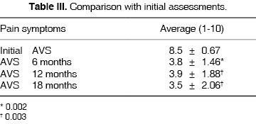 Pain symptoms were assessed on a 1 to 10 scale (Analogous Visual Scale). Where 10 would be the highest degree of pain and 1 absence of pain. Initially, patients exhibited an 8.5 AVS average rating. 18 months after procedure a significant improvement could be observed; patients then exhibited a 3.5 rank in the AVS scale (Table III).