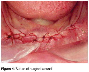 The patient was placed under local anesthesia with 2% lidocaine and 1:100.000 epinephrine. A 4 cm long incision was made at the anterior-inferior alveolar ridge crest (lower incisors area). A mucoperiosteal flap was raised which exposed residual alveolar bone in the lower anterior region of the mandible. The first surgical bed was achieved; a parallelism pin was placed before proceeding to second surgical bed, and so forth until achieving four receptor beds. Four 4 mm diameter x 16 mm long titanium screw implants were placed (Sulzer Dental Inc Taper Lock Screw TLB16) (Figure 3). First suture was undertaken with continuous sutures (Figure 4) and postoperative indications were issued. Oral administration of ibuprofen 400 mg, and amoxicillin, 500 mg, every 8 hours, during four days was prescribed. The following day, treatment was continued with 10 daily sessions of hyperbaric oxygen, 100% oxygen at 2.4 ATM pressure. Sessions lasted 90 minutes. Total was 30 sessions (20 sessions before surgery and 10 sessions after surgery). The patient did not experience any postoperative complication.