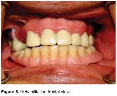 In addition to anchorage benefits achieved with use of bone-integrated implants, this type of rehabilitation elicits a suitable esthetic result by allowing presence of volume in a deficient zone (as consequence of performed resections).The patient experiences more comfort and security since these rehabilitations exhibit suitable anchorage. Moreover, accessibility to the area is preserved, since the patient can easily remove the rehabilitation devices and thus perform suitable hygiene procedures. The area is equally accessible for constant inspection and control of any tumor recurrence.7