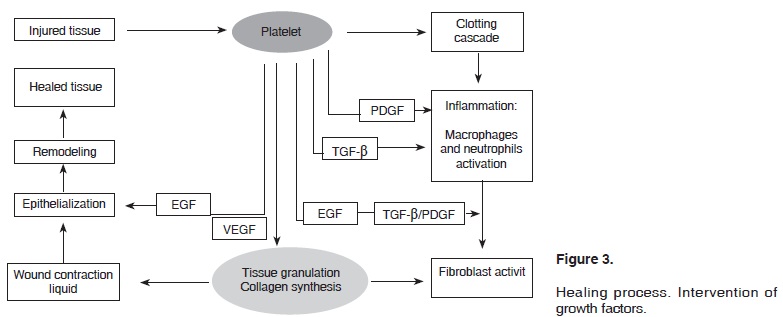 Growth factors are in charge of sorting out tissue reparation and regeneration. This action depends on the release of these active principles at the right moment and place, to thus initiate a sequence of events which has the aim of restoring normal architecture of the tissue where they are found (Figure 3).3