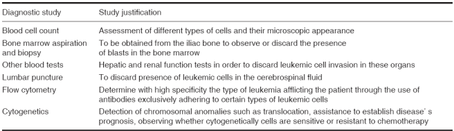 Medical diagnosis of leukemiais based on characteristic symptomatology as well as laboratory studies prescribed for the patient (Table II), Bone marrow aspiration is generally indicated to corroborate diagnosis, in order to assess whether blast invasion is absent or present; the aforementioned diagnosis might be emitted in cases where there is medullar blastosis exceeding 30% of total cell population. Beside cell counts revealed by laboratory tests, characterized by exhibiting high leukocyte numbers (exceeding 50,000 mm3)) as well as reported presence of blasts, there is important decrease in the count of platelets, neutrophils, hemoglobin and erythrocytes.
