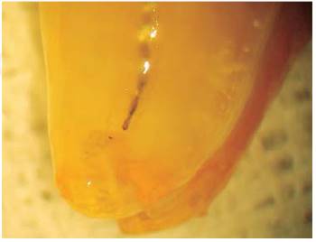 The crown was accessed with a number 4, high speed, round burr (Jet SDS Kerr-Mexico City), canal location and permeabilization was conducted with type K file, number 8 or 10 (VDW GmbH, Germany). Irrigation was performed with 5.25% sodium hypochlorite (Viarzoni T, Mexico City). With clip inserted in alginate (mark) a number 15 or 20 type K file was introduced (VDW GmbH), in accordance with the file that did fit, assessed by means of tactile sensation and apparent measurement in the X-ray. Screen of Raypex 6 device (VDW Munich, Germany) indicated the position of the apical foramen in the red bar. K file was then readjusted (VDW GmbH, Germany) in the first two yellow bars. It was reserved for 10 seconds until reading was stabilized, the K file (VDW GmbH Germany) holder was removed and was fixated to the tooth with acrylic resin. With foramen locator, reading was once more verified. Teeth were diaphanized with nitric acid technique, and were then preserved in methyl salicylate. Pictures were obtained with clinical microscope OPMI 1 FR PRO (Zeiss Mexico) at 16x as well as with a digital camera (Sony, Japan). Digital images were obtained which were then evaluated by two endodontic specialists, blinded and calibrated to identify the limit of the apical foramen; a subjective value was assigned: accurate when the tip of the file was at 0 to 0.5 mm, external or positive (+) when the file was ± 0.1 mm or more, and short or negative (-) when it was at -0.5 mm or less with respect to the apical foramen. No samples were excluded in the present study.
