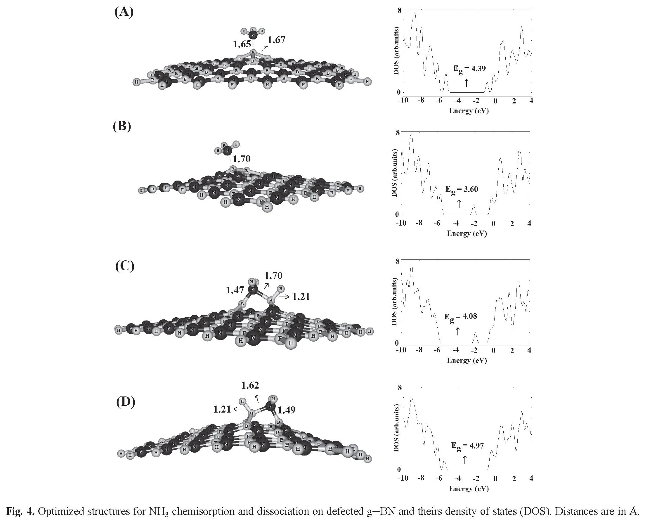 Subsequently, we have explored NH3 adsorption on the defected site by locating the molecule above the impurity atom with different initial orientations including H or N atom of the molecule which is close to the BN atom. We have also put the molecule on a B-B bond so that the H and N atoms are located on the top of the B atoms. However, after relax optimization of the initial structures, five stable configurations were obtained which have been shown in Figs. 4, and 5. We have divided the interactions, according to these minima structures, into two types: (I) chemisorption, in which the Ead value is rather large in comparison with the pristine g-BN, and an insignificant change occurs in the geometrical parameters (configurations A and B, Fig. 4); and (II) dissociation, a very strong interaction that largely deforms the structure of the sheet and the molecule with bond cleavage and formation (configurations C and D, Fig. 4). Also, in one of the dissociation configurations, NH3 molecule strongly interacts with the defected g-BN and one H2 molecule was released (configuration E, Fig. 5). The Ead, charge transfer, and Eg for all configurations have been summarized in Table 2.