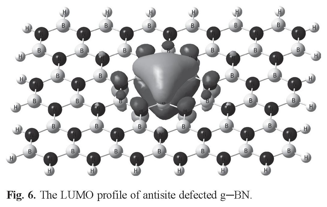 A g-BN consisting of 36 boron and 36 nitrogen atoms was considered, whose end atoms were saturated with hydrogen atoms to avoid the boundary effects. The full geometry optimizations and property calculations on the pristine and antisite defected g-BN in the presence and absence of a NH3 molecule were performed using three-parameter hybrid generalized gradient approximation with the B3LYP functional and the 6-31G basis set including the d-polarization function (denoted as 6-31G (d)) as implemented in the GAMESS suite of program [29]. GaussSum program [30] was used to obtain DOS results. In order to plot DOS plots, the orbital energies were set to be -10 to 4 eV and the full width at half maximum was 0.3 Å. The B3LYP density functional has been previously shown to reproduce experimental proprieties and has been commonly used for nanostructures [31-34]. It has also been demonstrated that the B3LYP provides an efficient and robust basis for calculations of III-V semiconductors by Tomić et al. [35], capable of reliably predicting both the ground state energies and the electronic structure. The adsorption energy (Ead) of an NH3 molecule on the g-BN is obtained using the following equation: