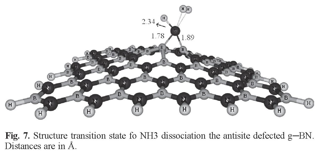 Fig. 5 shows the chemical functionalization of the defected g-BN by NH3. In this configuration, -NH fragment has diffused into the defected site from its N atom, so that two new BN-N and B-N bonds are formed with the bond lengths of 1.42 and 1.46 Å, respectively. Interestingly, an H2 molecule in this configuration has escaped from the sheet of defected g-BN. In this configuration (E), the Ead value is about -1.35 eV, somewhat weaker than that of C and D configurations. We think that the more positive value of Ead in this configuration can be attributed to the large deformation of NH3 and also the sheet after the adsorption process. The results indicate that our proposed system may be a promising material for hydrogen storage. We also calculated the barrier energy for this process. Transition state structure is shown in Fig. 7, which has been optimized using the Synchronous Transit-Guided Quasi-Newton Method. The calculation shows that releasing an H2 molecule needs the reaction process to overcome an energy barrier of 0.65 eV, which is relatively large. Thus, we think that these reactants may need to be heated to higher than room temperature to surmount this barrier energy. Also, our calculation shows that energy of 4.68 eV is needed to remove the -NH from the g-BN which is very high .We believe that the large energy is because of high instability of free -NH group. In our opinion, removal of this radical might be facilitated by using an auxiliary chemical group which needs more research.