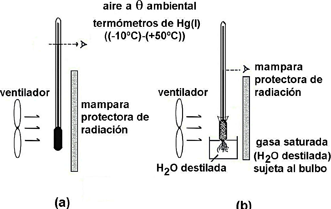 Figura 1 Esquema experimental para la medición de la temperatura de bulbo seco (a) y de bulbo mojado (b).