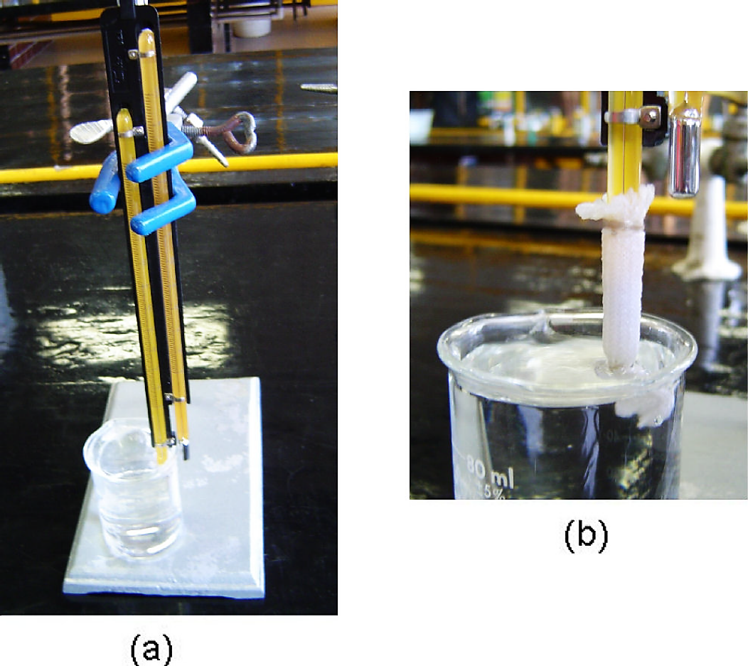 1. Llenar un vaso de vidrio con H2O(l) monodestilada, la cual mojará la mecha del bulbo, y que se llamará aquí bulbo mojado. Asegurarse que en el proceso de llenado se moje muy bien la mecha, y en toda su longitud.