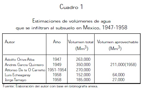 De acuerdo con el titular de la SRH, en 1947 las estimaciones más confiables acerca del agua era que del 100% de la precipitación total anual de México, 17% se infiltraba al suelo para formar depósitos y corrientes subterráneas, 60% se evaporaba y transpiraba, y 23% escurría superficialmente. Esto significaba alrededor de 263 mil millones de metros cúbicos de agua en el subsuelo al año "cuyo aprovechamiento para riego, abastecimiento de agua potable o usos industriales es de vital importancia para el país" (Orive Alba, 1960: 14-16).