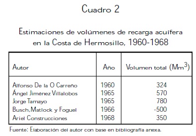 En forma similar a las expectativas que hubo en cuanto a la disponibilidad de agua subterránea en el país, el potencial de la recarga acuífera en la Costa de Hermosillo fue disminuyendo conforme el paso del tiempo. La única excepción lo fue el primer estudio realizado por De la O Carreño en 1960, quien desde el principio estimó la cifra más baja de todas las propuestas (cuadro 2).