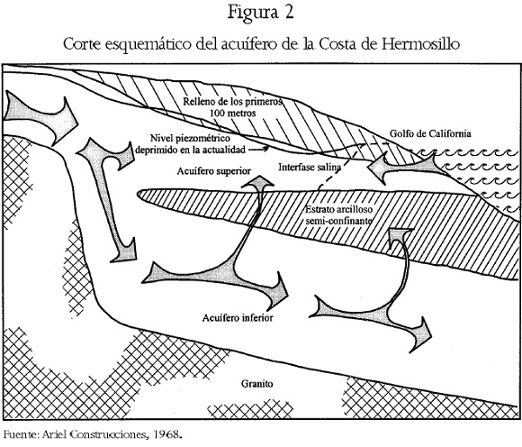 Este trabajo fue el que determinó también las características básicas y el funcionamiento del acuífero conocidas hasta la actualidad: la existencia de dos acuíferos interconectados entre sí, separados por un manto arcilioso de origen marino con espesor variable. El primer acuífero (llamado superior) con un espesor de 200 m; el manto arcilloso con espesor de 400 m cerca del mar y que desaparece al interior del continente; y el segundo acuífero (llamado inferior) con espesores variables hasta los 700 m de profundidad, lugar donde se presenta el basamento granítico regional. La alimentación proviene en 22% de las partes altas de los ríos Bacoachi y Sonora y el 78% restante del acuífero inferior a través del manto arcilloso, ignorándose la alimentación total de este último (figura 2).