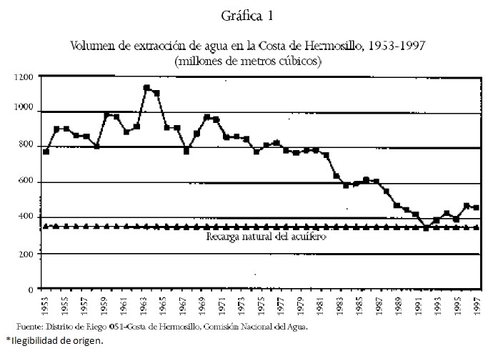 Así, la cifra de recarga natural en el acuífero de la Costa de Hermosillo de 350 Mm3 llegó 23 años después de la perforación del primer pozo profundo en la región. Y varios años después de la emisión de diversos ordenamientos jurídicos tendientes a regular la extracción de agua, tales como: 4 decretos de veda (1951, 1954, 1963 y 1967),9 el citado reglamento de explotación (1963) que en los hechos constituyó el primer programa de reducción de extracciones, un reglamento de operación del distrito de riego (1966) y la creación de un consejo de conservación de los recursos geohidrológicos (1956).