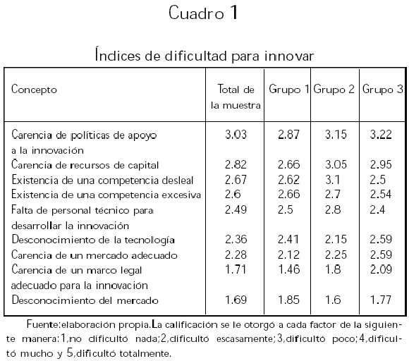 En este punto la opinión de los empresarios se recogió mediante la instrucción siguiente: "Califique las principales dificultades que enfrentó su empresa en el proceso innovador". El otorgamiento de la calificación tenía cinco posibles respuestas, las cuales, junto con la información obtenida, aparecen en el cuadro 1. Se sumaron las calificaciones de las 67 empresas y se obtuvo la media, así como también para cada uno de los grupos.