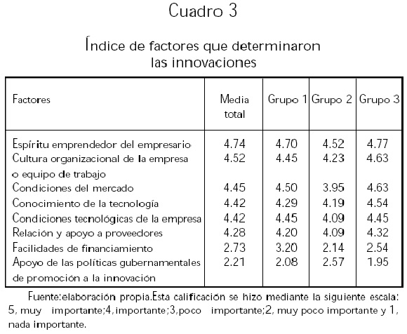 En este apartado la pregunta fue: "¿Cuál es la importancia de los factores que contribuyeron al éxito de la innovación?" Los resultados y escala aparecen en el cuadro 3.