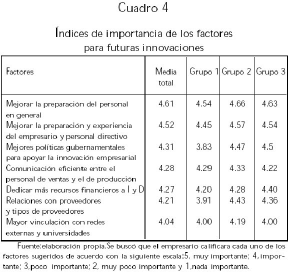 En este apartado la pregunta fue: "¿Cuáles son los factores más importantes para que su empresa realice innovaciones en el futuro?" Los resultados aparecen en el cuadro 4.