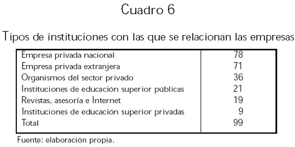 Para saber el tipo de instituciones con las cuales generalmente se relacionan las empresas para abastecerse de tecnología, se les pidió que mencionaran los organismos y qué tipo de insumos obtienen de ellos: adquisición de tecnología, información especializada, recursos humanos, capacitación y servicios informáticos. Los tipos de organismos más mencionados pueden verse en el cuadro 6.
