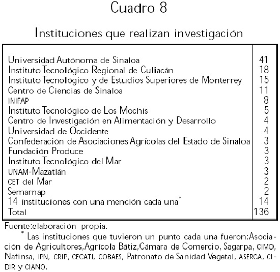Los empresarios depositan en forma prioritaria la confianza para la realización de redes y alianzas con otras empresas, principalmente en la empresa nacional; muy abajo clasifican las instituciones de educación superior, sean éstas públicas o privadas. En este aspecto las empresas desearían tener convenios de trabajo con el ITESM, pero consideran que la institución que realiza investigación en la entidad es la Universidad Autónoma de Sinaloa, lo cual significa que esta búsqueda de alianzas no está sustentada en la promoción de la investigación.