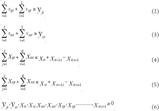 donde para el mes t, πt-1= (1/1+it)t-1 es el factor de descuento con it igual a la tasa de inflación; pcijt es el precio al mayoreo de sandía en el mercado j, proveniente del origen s; xsjt es la cantidad enviada de la región i al mercado j;pcsjt es el precio al mayoreo en el mercado j, proveniente del origen s; xsjt es el envío de la región s al mercado j;cpit es el costo de producción en i; xit es la cantidad producida en i; cpst es el costo de producción en s; xst es la cantidad producida en s; ctijt es el costo de transporte para enviar sandía de i a j; xijt es la cantidad enviada de i a j; ctsjt es el costo de transporte de s a j; xsjt es la cantidad enviada de s a j; cait,t+1 es el costo unitario de almacenamiento en la región i del mes t al t+1; xit,t+1 es la cantidad almacenada en i del mes t al t+1; cast,t+1 es el costo unitario de almacenaje en la región s del mes t al t+1; xst,t+1 es la cantidad en bodega en s del mes t al t+1; piet es el precio de exportación de sandía enviada de la región i a la frontera e; xiet es la cantidad exportada de la región i a la frontera e; pset es el precio de exportación de la fruta de la región s a la frontera e; xset es la cantidad exportada de la región s a la frontera e; ctiet es el costo de transporte por enviar sandía de i a e; xiet es la cantidad enviada de i a e; ctset es el costo de transporte de s a e; xset es el envío de la región s a la frontera e; yj- es el consumo de sandía en el mercado j; ye son las exportaciones enviadas a la frontera e.