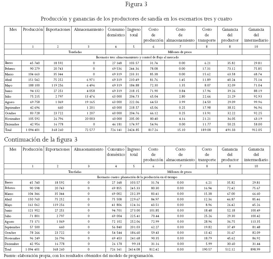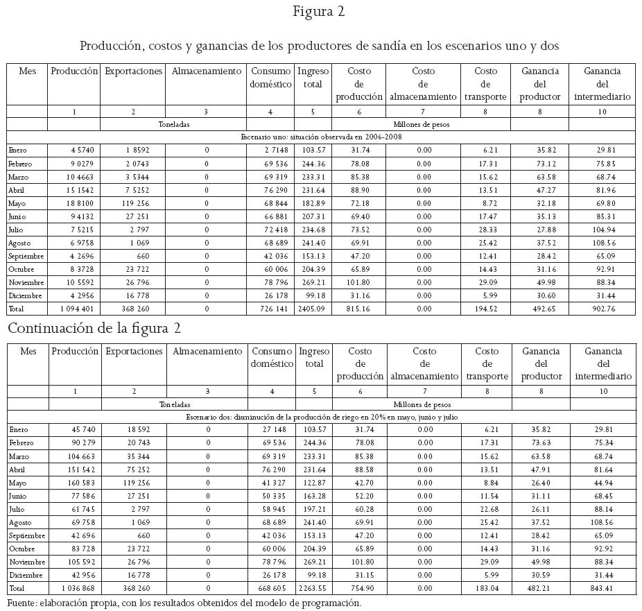 La ganancia se obtuvo en cuatro escenarios; el primero correspondió al base, o situación observada en el año promedio 2006-2008. En el segundo se analizaron los cambios en ingresos-costos-ganancias, con una reducción de 20 por ciento en la cosecha de riego en los meses de abundancia (mayo, junio y julio). En el tercer escenario se propuso la aplicación de un programa de almacenamiento para controlar el flujo del producto en el mercado. La cuarta solución supuso una distribución temporal homogénea de la sandía en los meses en que se obtiene, es decir, si la de una región se consigue en tres, se supone que es igual en cada mes. Debido a que el cultivo de temporal está sujeto a condiciones que no se pueden modificar (climáticas), los cambios sólo se aplicaron para la modalidad de riego. En los escenarios uno, dos y cuatro no se consideró el almacenamiento.