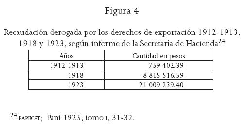 Esta situación se entiende al conocer el contexto de la política arancelaria del comercio exterior de esos años, caracterizada por su desequilibrio, puesto que se gravó con más rigor los productos de exportación en comparación con las importaciones. Que a la mercancía importada se le gravara menos lo explica la carencia de alimentos, que se tuvieron que importar, sobre todo durante los años más agudos de la lucha armada. Por otro lado, la bonanza de las ventas de petróleo, ciertos minerales, textiles y productos agrícolas obligaron a las autoridades a fundamentar la entrada de ingresos al erario público por medio de las exportaciones, con el argumento de que en realidad el impuesto recaía sobre el consumidor extranjero. La política económica del gobierno revolucionario tendió a abrirse hacia el exterior "[...] el coeficiente medio de protección se redujo a 22 por ciento, y se mantuvo por debajo del 20 por ciento hasta 1923." Después, ante la caída de la demanda de varias exportaciones y, en consecuencia, la disminución en los precios obligaron al gobierno a subir los aranceles en las importaciones, ya que las exportaciones dejaron de dar los rendimientos suficientes para el pago del gasto público (Collado 1995, 204-205) (véase figura 4).