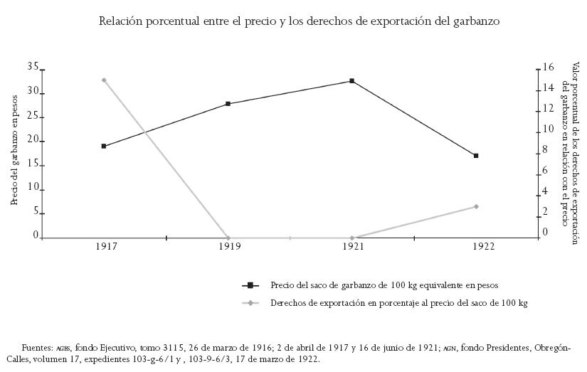 Para que los factores internos de la inestabilidad mencionados no perjudicaran al sector agrícola del noroeste de México, el régimen revolucionario otorgó ciertas concesiones a las autoridades estatales, agentes regionales y productores apostando al auge de las exportaciones para obtener recursos. Así, se decretó la disminución de 2 centavos sobre los derechos de exportación por kilo de garbanzo, es decir, el impuesto bajó de 8 a 6 centavos. Además, se dispuso la distribución de la tercera parte de la cantidad recaudada por este concepto entre los municipios productores de Sonora y Sinaloa,6 y se nombró a un agente del gobierno por municipio para intervenir en la venta de la leguminosa. Dichas prerrogativas sugieren la debilidad de las autoridades centrales frente al poder de la clase política regional.7