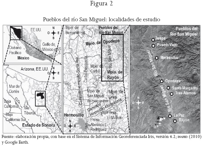 Tuape, Pueblo Viejo, Merésichic, Opodepe, Santa Margarita, Tres Álamos, La Paz y Rayón (véase figura 2) son las localidades involucradas en la experiencia analizada y están ubicadas en los municipios de Rayón y Opodepe; se conocen como los pueblos del río San Miguel, ya que se fundaron y están cerca de éste, cuyo curso permanece seco la mayor parte del año, salvo durante la época de lluvias (julio-agosto), y con excepción de escasos lugares con caudal constante (cerca de Rayón).