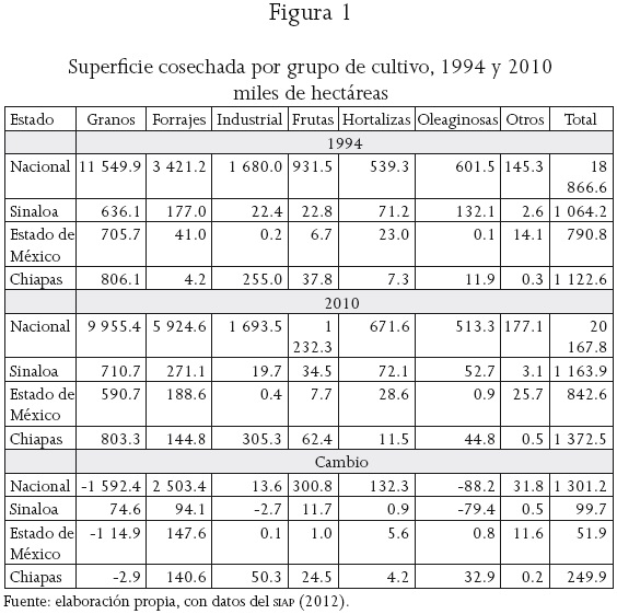 En Sinaloa, la superficie cosechada total aumentó de 1.06 millones de hectáreas, en 1994 a 1.16 millones, en 2010. Su estructura productiva es predominante en granos, pues en 1994 constituía 59.8 por ciento del área cosechada y en 2010 incrementó a 61.1. Durante el mismo periodo, los forrajes y las frutas aumentaron de 16.6 a 23.3 por ciento y de 2.1 a 3.0 su participación, las oleaginosas decayeron de 12.4 a 4.5 y las hortalizas de 6.7 a 6.2 (véase figura 1).