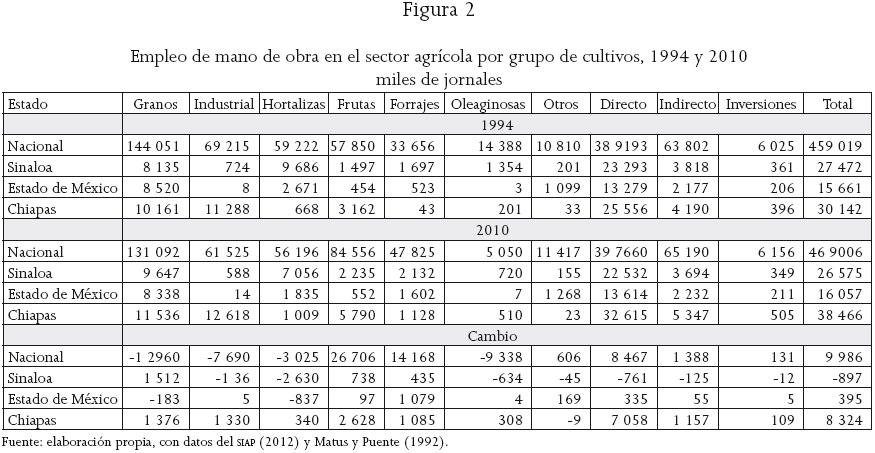 Para observar los niveles de empleo agrícola antes y después de la implementación del TLCAN, se realizó una evaluación para 1994 utilizando los requerimientos de mano de obra por cultivo estimados por Matus y Puente (1992). Para 2010, el empleo agrícola se calculó con los costos de producción estimados por la Secretaría de Agricultura, Ganadería, Desarrollo Rural, Pesca y Alimentación (SAGARPA), a través del Servicio de Información Agropecuaria y Pesquera (SIAP), durante 2005, toda vez que resultan ser los más completos para derivar los requerimientos de mano de obra por cultivo y estado.