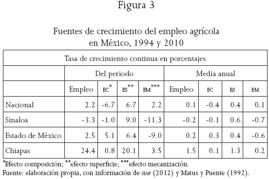 En todo el país se determinaron las fuentes de crecimiento del empleo agrícola y, para especificar los cambios de éste a escala de entidad federativa, el mismo análisis se efectuó en Sinaloa, Estado de México y Chiapas. La razón principal que justifica la selección de dichos estados es su ubicación geográfica (noroeste, centro y sur del país), que determina que las estructuras productivas agrícolas, la mecanización y las condiciones climáticas sean distintas.