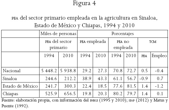 De acuerdo con el INEGI, en 1994 la PEA del sector primario en Sinaloa sumó 244.6 miles de personas, de este total 38.9 por ciento trabajó en la agricultura. Para 2010, la PEA ocupada en el sector primario bajó a 212.2 miles de personas, y la PEA del sector primario, empleada en la agricultura, aumentó a 43.3 por ciento (véase figura 4).