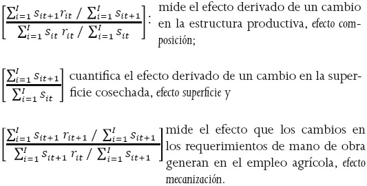 Si se consideran los factores que se incluyen en el cálculo del empleo directo, resulta pertinente estimar las fuentes que pueden hacer variar el dato. En este sentido, el crecimiento del empleo directo puede provenir de los siguientes cambios: a) en la superficie cosechada, al cual se denomina efecto superficie; b) en los requerimientos de mano de obra por hectárea por cultivo, al que se llama efecto mecanización o c) en la estructura productiva de cultivos, efecto composición.