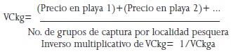 También se incluyó el valor comercial por kilogramo (VCKG); representado por el valor monetario promedio del kilo de captura en cada localidad, como mesura del valor económico. Se calculó a través del promedio de los precios por kilo de las capturas, datos obtenidos en las entrevistas. Fue necesario calcular el inverso multiplicativo, para despejarla como variable independiente: