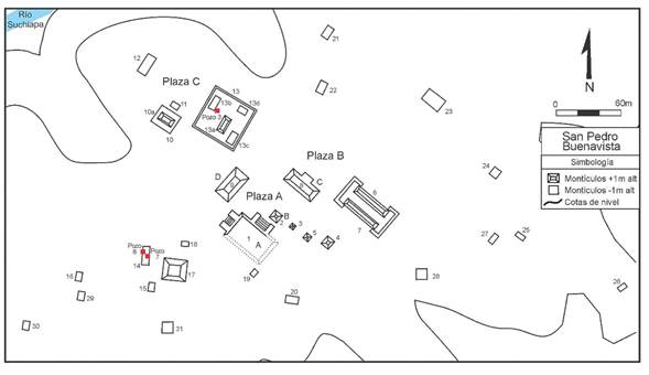 Figura 10 Plano del sitio San Pedro Buenavista. Redibujado, con modificaciones, de Berlin, 1946.