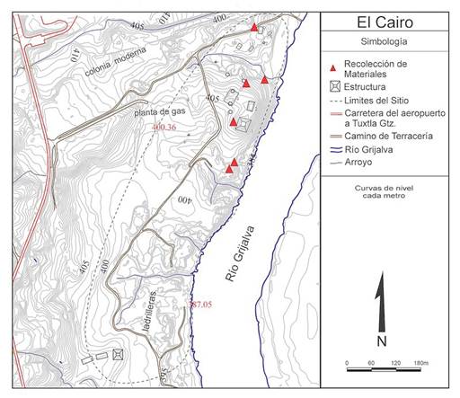 No obstante, el sitio de Mactumatzá se encuentra muy afectado por la construcción de antenas de transmisión de televisión y microondas, las cuales han sido levantadas sobre las estructuras. Además, el antiguo asentamiento es atravesado por una vereda que facilita el acceso a las antenas para su mantenimiento y también es utilizada por los senderistas que suben desde Tuxtla Gutiérrez. Por otro lado, en la ribera oeste del Grijalva se ubican los sitios de Cupía, El Cairo y Jardines de Grijalva. Si bien esta área fue reconocida previamente (Lowe, 1959:29 ; Navarrete, 1966:40-41 ; Sorenson, 1956:25 ), no se contaba con ningún mapa o croquis que permitiera evaluar el tamaño y organización interna de las comunidades que por su cercanía a la capital chiapaneca pueden considerarse como suburbios o dependencias directas de ella. Estos tres sitios habitacionales-ceremoniales han sufrido distintos niveles de alteración por las actividades coloniales y contemporáneas. El sitio de Cupía fue parcialmente destruido durante la construcción de una planta de tratamiento de agua potable, pero aún se conservan dos montículos en la parte posterior del cementerio local. El segundo sitio es El Cairo (véase figura 6) originalmente reportado por la localización de un entierro del Postclásico Temprano, en una mina de grava (Lowe, 1959:68). Nuestros trabajos permitieron identificar en los terrenos del rancho San Antonio una porción del sitio inmediato al río Grijalva y consideramos que la sección previamente reportada desapareció al construirse la ampliación de la carretera Tuxtla-Cupía. Se identificaron dos conjuntos arquitectónicos con edificios cívicos-ceremoniales construidos sobre afloramientos de piedra caliza y grava, mientras que la zona habitacional está distribuida alrededor de ellos, en terrenos planos con depósitos de arcilla hoy utilizados como ladrilleras.