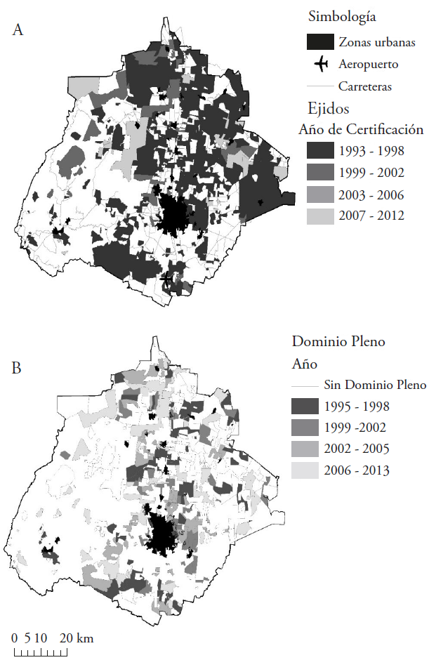 Prior to this and as result of the Mexican Revolution, a prolonged process of land distribution was implemented from 1917 to 1992. At the end of the period, more than half of the territory was assigned to peasants under the form of what we know today as ejidos and agrarian communities (Zúñiga and Castillo, 2010; RAN, 2014). Ejidos are agrarian nuclei with autonomy in land management that mix private and common goods. They are divided into four zones: (1) human settlement; (2) growth reserve; (3) farming lands; and (4) communal lands (Secretaría de la Reforma Agraria, 1992). In their origin they had strict rules that prohibited the sale and rent of the land. In turn, sowing the farming lands was considered to be mandatory, since idle lands were expropriated from their owners (CEPAL, 2002; Warman, 2003). In 1992 a reform was implemented that gave total autonomy to the ejido assembly in decision making in matters of land use and enabled the ejidatarios to make a partial or total division of their lands to be transferred to the regime of private property through the acquisition of full dominion (Secretaría de la Reforma Agraria, 1992; 1993; Barba and Valencia, 2013). To regulate these sales and with the aim of giving legal certainty to land tenure, in 1993 the Certification Program of Ejido Rights and Entitlement of Urban Plots (Programa de Certificación de Derechos Ejidales y Titulación de Solares Urbanos, PROCEDE) was created, which by its end in 2006 had given out tenure titles to 92-24 % of the agrarian nuclei. During the certification the external and internal limits of the ejidos were measured, and the four zones that integrated them were defined, all of this in agreement between the ejido assembly and the agrarian authorities (Secretaría de la Reforma Agraria, 2006).