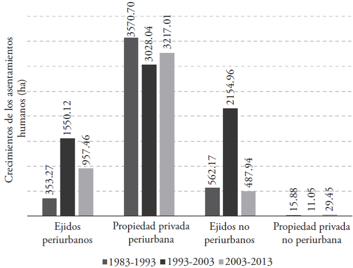 We highlight that the growth of human settlements in not peri-urban ejidos was higher than in the peri-urban (Figure 4). It is possible that these figures have been overestimated in the thematic maps, because due to the geographic scale used the edifications and other rural elements were generalized, such as: idle plots, street plans, family orchards, among others. This causes for the perimeter classified as human settlement to have a larger extension than the actual one. Therefore, the typical disperse arrangement of rural human settlements multiplied by the high number of disperse rural localities resulted in a larger surface of human settlements. However, we cannot rule out that there was growth favored by the endowment of reserves of ejido growth.