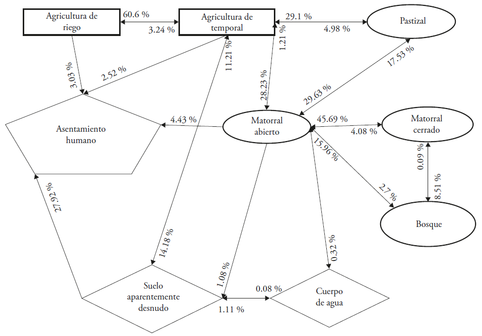 Figure 6 Replacement between different types of land cover in the ejidos of Aguascalientes between 1993 and 2013. The numbers indicate the percentage of the original cover that was transformed; for example, 60.6 % of the rainfed agricultural surface was transformed into irrigation agriculture and 3.24 % of the irrigation surface was converted into rainfed agriculture.