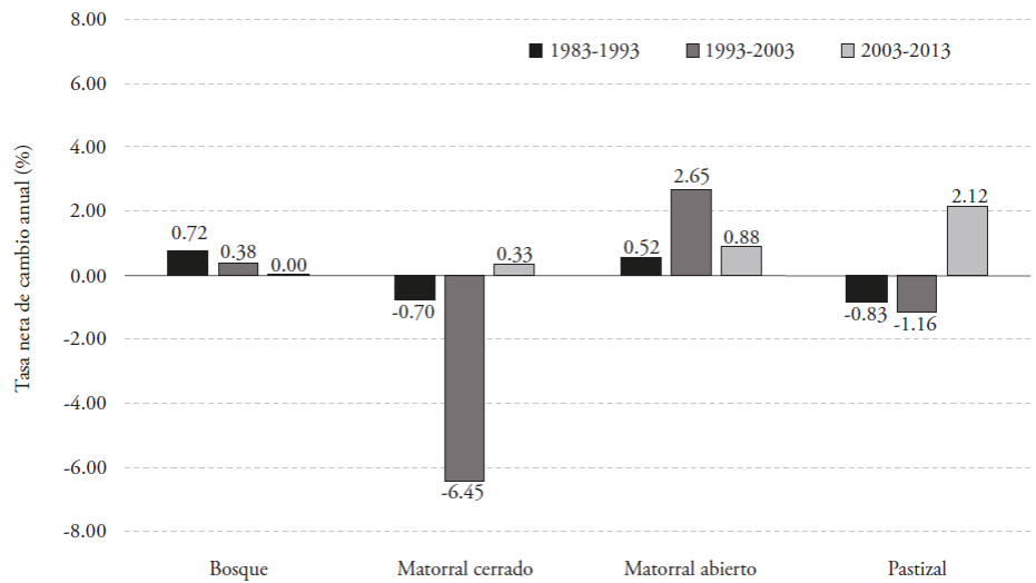 Regarding forest resources (forests, shrubs and grasslands), their recovery after 1993 is an optimistic scenario for the conservation of natural resources in the region. Chapa-Benzanilla et al. (2008) describe the gradual recovery of the forest cover inside the Sierra Fría Natural Protected Area.