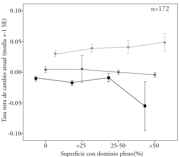 Figure 8 Net annual change rates in land use according to the degree of acquisition of full dominion. F values between groups: Agriculture, black squares, F=1.996, p=0.116; Vegetation, dark grey circles, F=0.053, p=0.984; Human settlement, light grey rhombus, F=0.882, p=0.452.