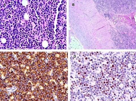 Figura 4: A) Neoplasia hematolinfoide con linfocitos monomórficos con escaso citoplasma eosinófilo. B) Formación de agregados que involucra difusamente la serosa. C) CD20 positivo. D) Ácido ribonucleico (codificado por Epstein Barr positivo (EBER1).