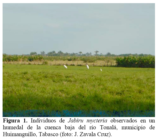 La presencia de esta ave en el estado de Tabasco está documentada para la zona de los Pantanos de Centla, donde se tienen registros de su nidificación (Correa y Luthin 1988, Peterson y Chalif 1989). Esta zona, decretada en 1992 como Reserva de la Biosfera Pantanos de Centla, se localiza al noreste de dicho estado, formando parte del delta de los ríos Grijalva y Usumacinta, con una superficie de 302,706 ha (Vega-Moro 2005). El presente trabajo tiene como objetivo informar sobre la ocurrencia de la cigüeña jabirú en un humedal localizado en la parte oeste del estado de Tabasco.