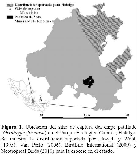 El chipe patilludo (Geothlypis formosa) es una especie que se distribuye en el este y centro de EUA y pasa el invierno principalmente desde el sur de México hasta Colombia y noroeste de Venezuela. En México, migra a través de las tierras bajas (0 a 1500 msnm) de Nuevo León y la vertiente Atlántica desde Tamaulipas hasta Veracruz e inverna desde el sur de Tamaulipas hasta Chiapas y la Península de Yucatán (Peterson y Chalif 1973, Howell y Webb 1995). En Hidalgo, de acuerdo con los mapas reportados por Howell y Webb (1995), Van Perlo (2006), BirdLife International (2009) y Neotropical Birds (2010), algunos individuos pasarían el invierno en la parte noreste del estado (Figura 1). Martínez-Morales et al. (2007) reportan la presencia de esta especie en Hidalgo como hipotética debido a que no existía información de campo que corroborara su presencia. Además, es importante mencionar que aunque recientemente se han realizado estudios en la zona noreste del estado y han sido reportados nuevos registros para el listado avifaunístico de Hidalgo (Rojas-Soto et al. 2002, Martínez-Morales 2004, Sánchez-González y López de Aquino 2006, Valencia et al. 2008, Valencia-Herverth et al. 2009, Valencia-Herverth 2010), el chipe patilludo no fue registrado en ninguno de ellos. El chipe patilludo habita en época reproductiva en bosques cerca de arroyos con sotobosque denso (Mcdonald 1998). En época invernal utiliza el sotobosque de bosques tropicales, bosques de montaña y vegetación secundaria (Howell y Webb 1995, Dunn y Garrett 1997, Peterson y Chalif 2008); además, se ha observado en parques y jardines suburbanos (Small 1994).