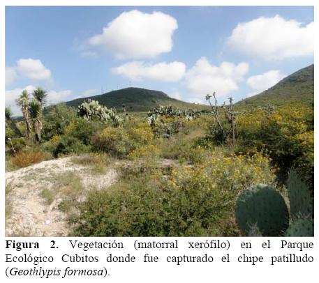 El individuo fue capturado el 09 de junio de 2010, en el Parque Ecológico Cubitos (20°05’43’’N, 98°44’04’’O; 2429 msnm), un área natural protegida a nivel estatal que se ubica al sureste de la ciudad de Pachuca, entre los municipios de Mineral de la Reforma y Pachuca de Soto (Figura 1). El Parque Ecológico Cubitos tiene una superficie de 92 ha (COEDE 2004) y está rodeado por la zona urbana de la ciudad de Pachuca (Zuria y Rendón-Hernández 2010). El principal tipo de vegetación en el parque es el matorral xerófilo (Figura 2) que se encuentra subdividido en matorral micrófilo, rosetófilo y crasicaule. El parque cuenta además con otros tipos de vegetación como pastizal, un bosquete de coníferas, un bosquete de yucas y un jardín botánico con cactáceas. Entre la vegetación correspondiente al matorral xerófilo abundan especies como Agave lechuguilla, Hechtia podantha, Coryphanta sp., Stenocactus sp., Senecios praecox, Yucca filifera, Opuntia streptacantha, O. spinulifera, O. robusta, Schinus molle, entre otros (COEDE 2004). La captura ocurrió alrededor de las 11:00 h en la zona de matorral xerófilo. El ejemplar fue identificado como Geothlypis formosa por mostrar el dorso color olivo y amarillo brillante en las partes inferiores, así como el superciliar (ceja) amarillo que se amplía detrás del ojo y se extiende por debajo del mismo, sin formar un anillo ocular completo y, de acuerdo con lo descrito por Pyle (1997), este individuo podría tratarse de una hembra (Figura 3). Fue marcado con un anillo metálico (pata izquierda) y uno de plástico de color azul (pata derecha) bajo la licencia de colector científico federal No. FAUT-0174. Las medidas morfométricas del ejemplar capturado fueron: cuerda alar = 68 mm y peso = 13 g. No se observó acumulación de grasa en el individuo. Posteriormente, el individuo fue liberado en el mismo sitio de captura.