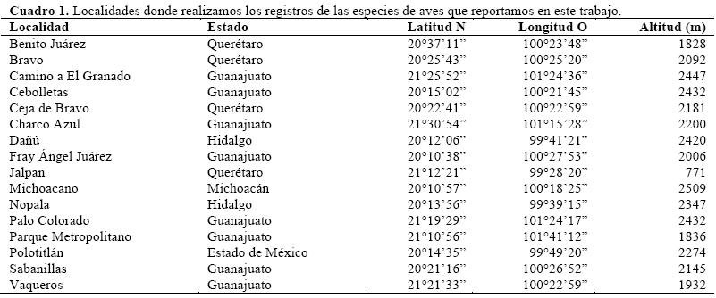 Los ambientes acuáticos de zonas semiáridas del estado de Querétaro y zonas adyacentes han mostrado tener una importante riqueza de aves acuáticas tanto residentes como migratorias (Pineda-López y Arellano-Sanaphre 2010, Tenorio-Guzmán 2010, Chapa-Vargas et al. 2011, Hiley 2012). En la presente contribución destacamos observaciones de especies nuevas para el inventario de los estados de Querétaro, Hidalgo y Guanajuato, así como de especies con pocos registros publicados para zonas alejadas de las costas en México. Dichas observaciones son resultado de un estudio con muestreos mensuales que realizamos de febrero de 2011 a marzo de 2012 en embalses de zonas semiáridas y subhúmedas de Querétaro y áreas adyacentes del Estado de México, Michoacán, Guanajuato e Hidalgo, así como de visitas esporádicas a la Sierra de Lobos en Guanajuato y a la Sierra Gorda de Querétaro (Cuadro 1). En todos los casos, realizamos un recorrido a pie por la orilla del eje mayor de la presa y de las zonas con mayor abundancia de aves, tratando de hacer un reconocimiento completo de ellas. Utilizamos binoculares 12x50 y en ocasiones una cámara EOS 1 con lente 170-500 mm. En la lista comentada que a continuación presentamos, los registros nuevos para Querétaro, Hidalgo y Guanajuato se indican respectivamente como Q*, H* y G*.