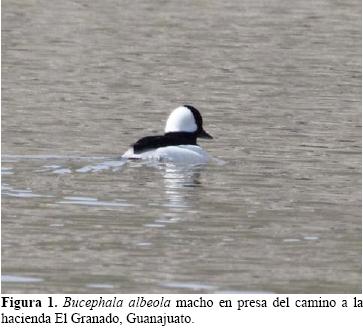 En Querétaro, observamos dos individuos en el Bordo Benito Juárez, el 12 de diciembre de 2003, y uno en la presa Ceja de Bravo, el 23 de febrero de 2012. En Guanajuato, observamos un individuo en la presa Vaqueros, el 5 de noviembre de 2010, dos en la presa Fray Ángel Juárez, el 28 de diciembre de 2011, dos en un bordo de la comunidad de Charco Azul, el 10 de abril de 2012, uno en una presa pequeña en el poblado de Palo Colorado y siete parejas con plumaje reproductivo en una pequeña presa en el camino a la hacienda El Granado, el 11 de abril del 2012 (Figura 1). Identificamos individuos jóvenes y hembras adultas de esta especie por su tamaño y su característica mancha blanca auricular; los machos adultos con plumaje de reproducción presentaron su patrón típico de coloración blanco-negro (Sibley 2001). Es una especie residente de invierno (noviembre-abril) para el norte y centro de México, donde no es común (Howell y Webb 1995). Ha sido reportada para localidades no determinadas en Guanajuato (Magaña Cota 2004, Friedmann et al. 1950), en embalses de municipios conurbados al norte de la Ciudad de México (Ramírez-Bastida et al. 2011), en el lago de Pátzcuaro (Alvarado 2005) y en el estado de Morelos (Urbina-Torres et al. 2009). En Guanajuato, también se ha observado en San Miguel de Allende y León (aVerAves 2012).