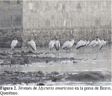 Encontramos 12 individuos jóvenes muy cerca de la cortina de la presa de Bravo, Querétaro, el 23 de febrero de 2012 (Figura 2). Esta es una especie residente en las costas del sur y sureste mexicano y se dispersa al norte después de la reproducción (Coulter et al. 1999); tiene registros ocasionales en el altiplano (Howell y Webb 1995), donde Williams (1982) observó grupos de hasta 50 individuos durante el verano. También se ha registrado en el lago de Cuitzeo en Michoacán (Tenorio-Guzmán 2010), en Arroyo Seco, al este de Querétaro (Navarro et al. 1993), y en la Laguna de la Media Luna en San Luis Potosí (Palacio-Núñez et al. 2008). Asimismo, se ha observado en San Miguel de Allende, León y Presa de Silva en Guanajuato (aVerAves 2012).